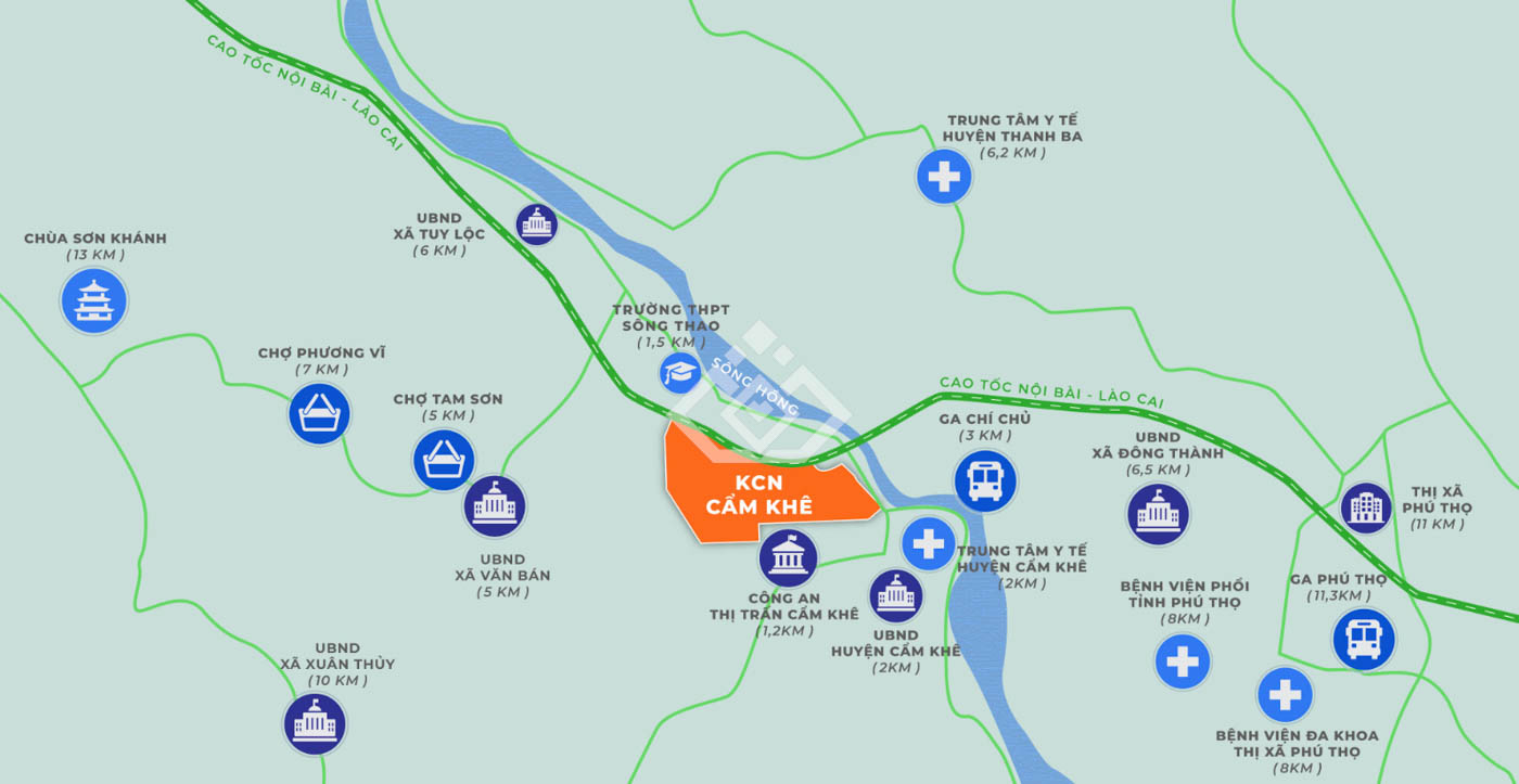 Ngoài ra, Khu Công nghiệp Cẩm Khê gần ga đường sắt Phú Thọ (thị xã Phú Thọ) và ga đường sắt Chí Chủ (huyện Thanh Ba). Khu Công nghiệp Cẩm Khê cách trung tâm huyện Cẩm Khê 3km, là nơi đặt 01 Bệnh viện đa khoa cấp huyện và các cơ sở y tế khác, các chi nhánh và phòng giao dịch của các ngân hàng như Agribank, Ngân hàng chính sách xã hội, có hai trường đào tạo nghề.